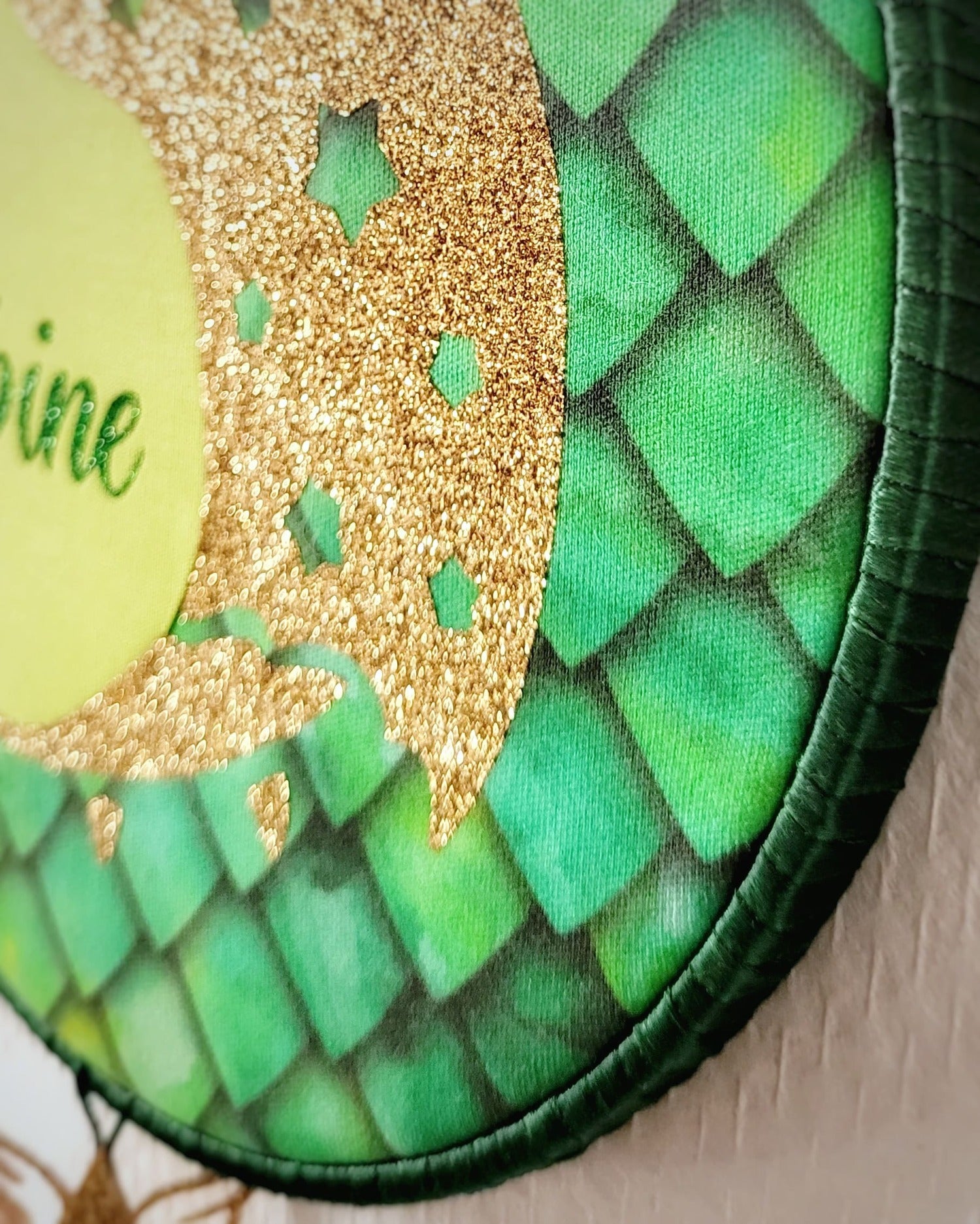 Sur ce modèle, la silhouette pailletée du Gardien Nébulon entoure et protège le prénom de votre enfant, comme une armure bienveillante chaque nuit.